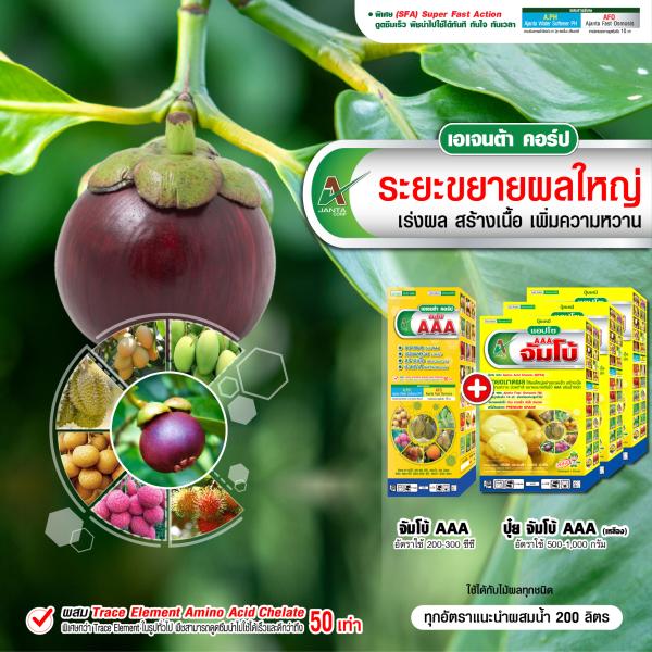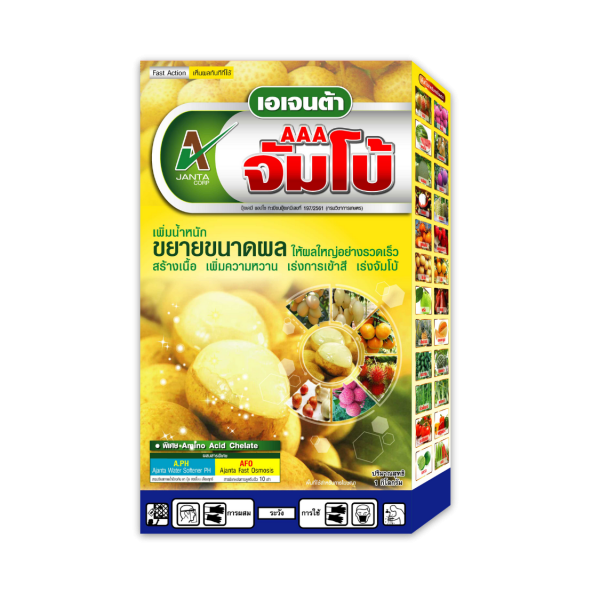 นวัตกรรมล่าสุดของ AJANTA CORP สารอาหารพืชสูตรเข้มข้นมีประสิทธิภาพ สูงสุดเท่าที่เคยมีมา ให้ผลลัพธ์ที่ชัดเจนทันใจ ทันเวลา • อยู่ในรูปของสารอาหารที่พีชสามารถดูดซึมได้ทันทีหลังจากฉีดพ่น • ช่วยให้พืชทนต่อสภาพอากาศหนาวจัด ร้อนจัด • ขยายผลจัมโบ้ AAA ทำสี สร้างเนื้อ เพิ่มน้ำหนัก เพิ่มผลผลิต